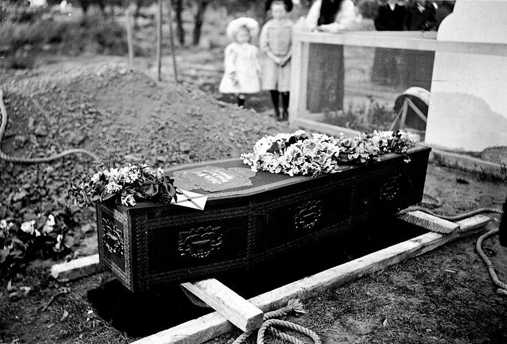 Coffin supported above a freshly dug grave. Two children stand in the background.