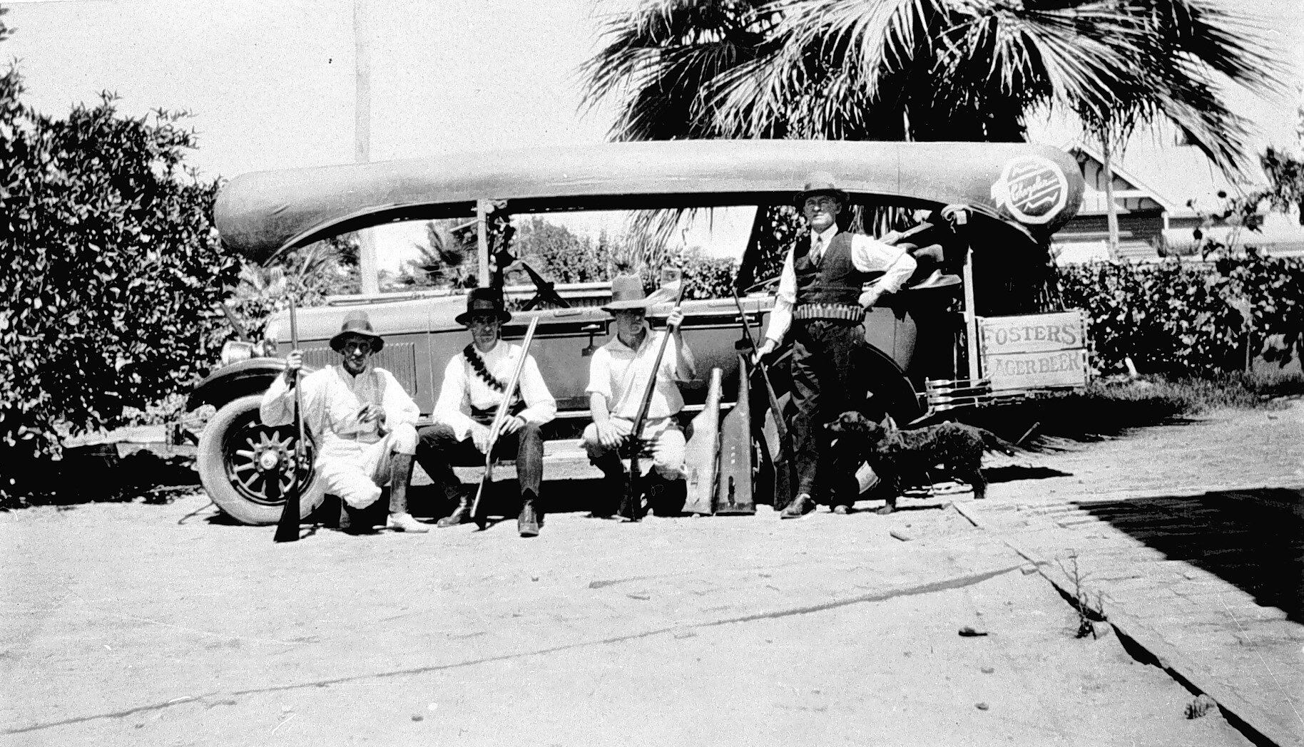 Duck (?) shooters beside a car. A canoe has been strapped to the top of the car and a beer crate to the back of the car.
