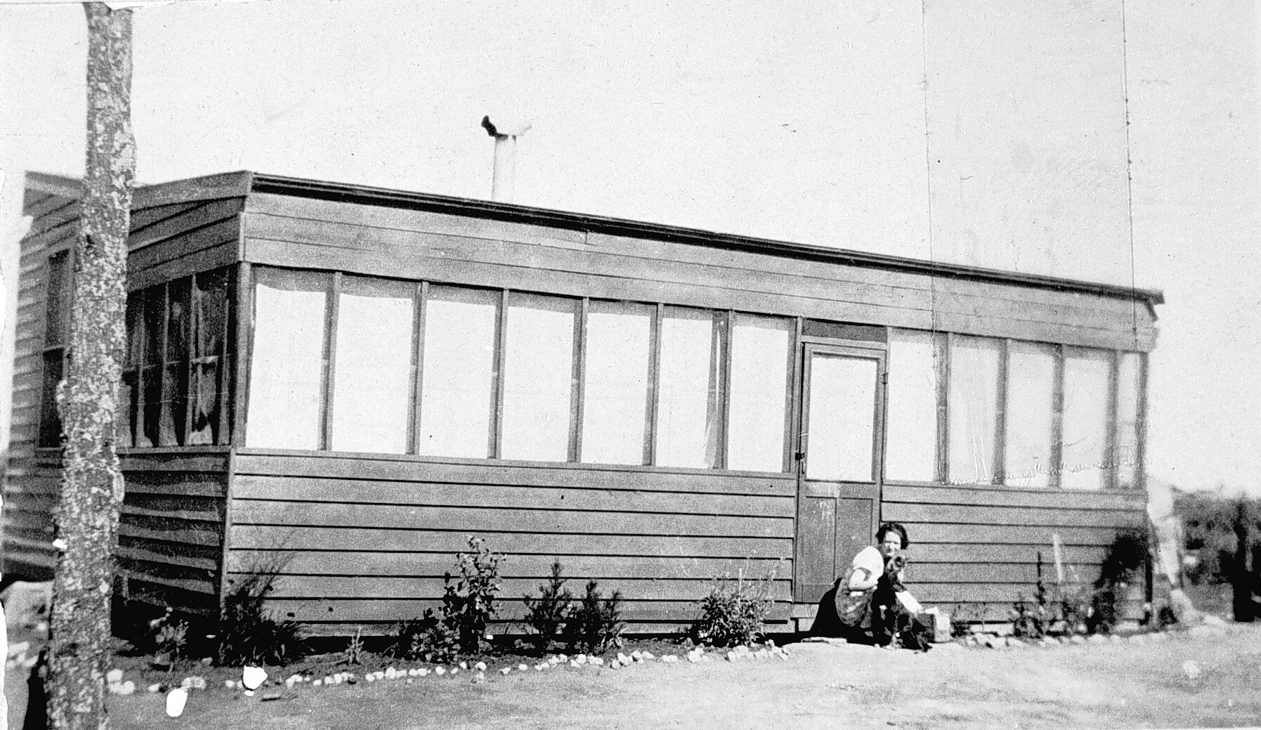 The third house on the settler 's block. A woman sits at the front door. She is holding a dog. (see also MM 005331,5334, 5336-7).