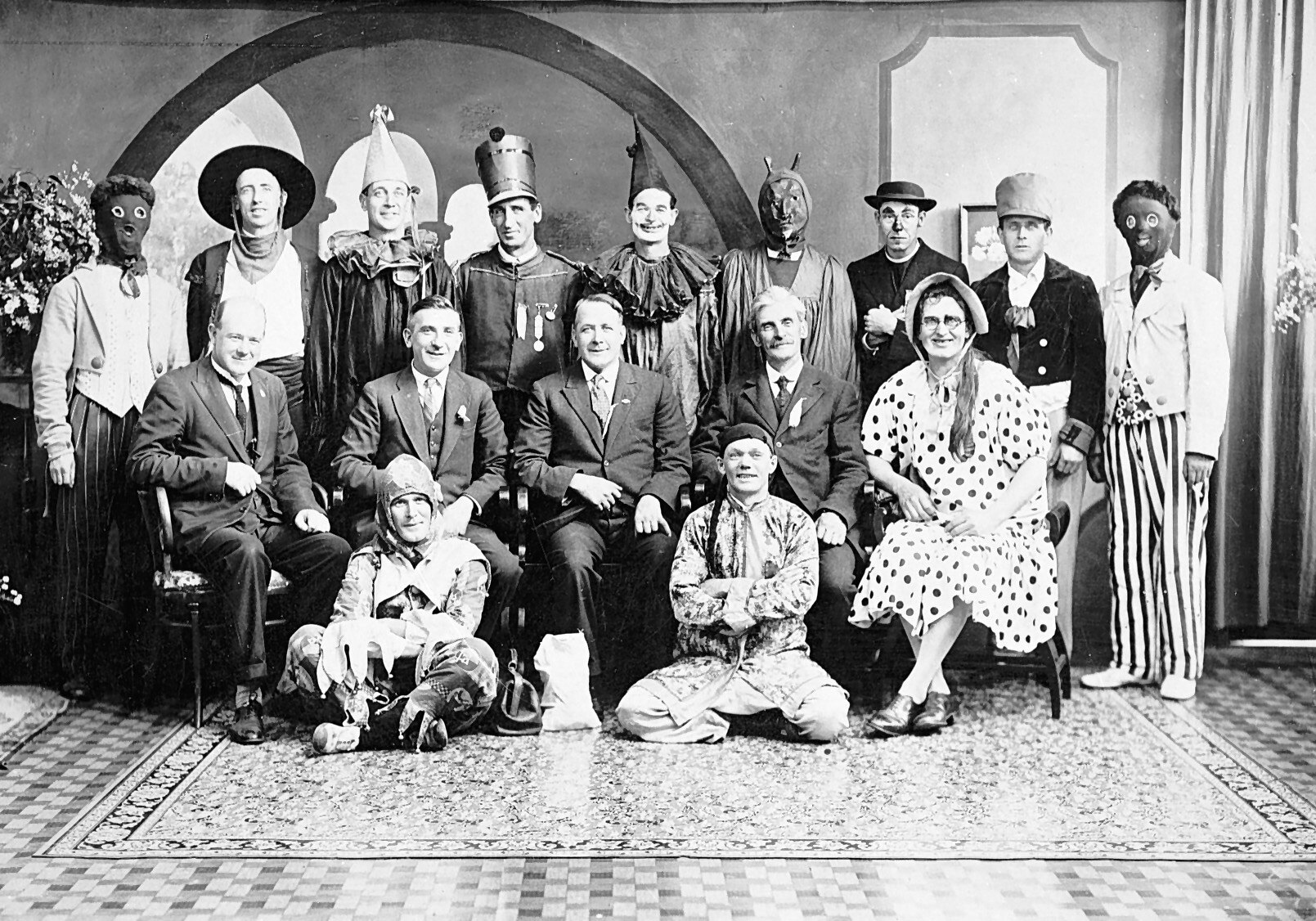 Men in fancy dress for a distress relief carnival held by the Mayors of Footscray and Yarraville. It was held at Western Oval.