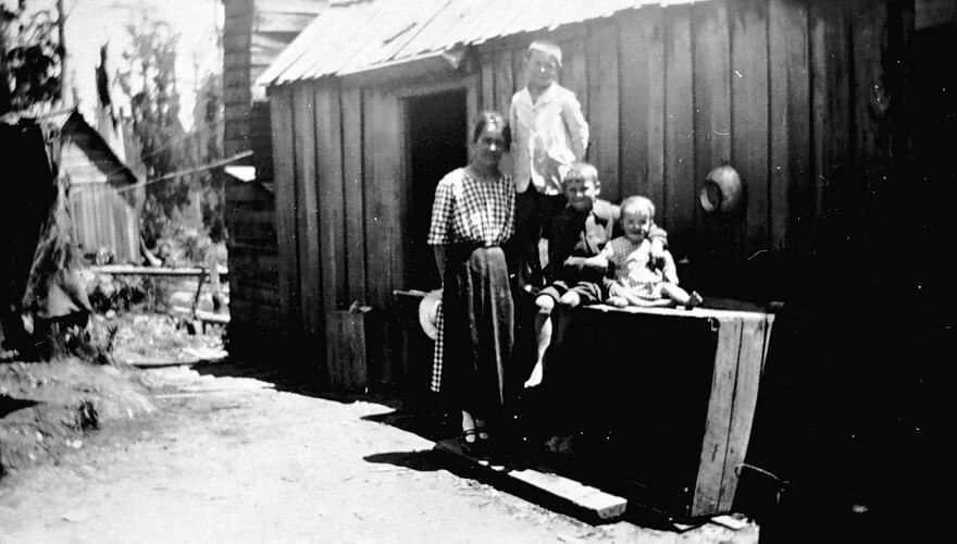 A women with three children in front of a hut.