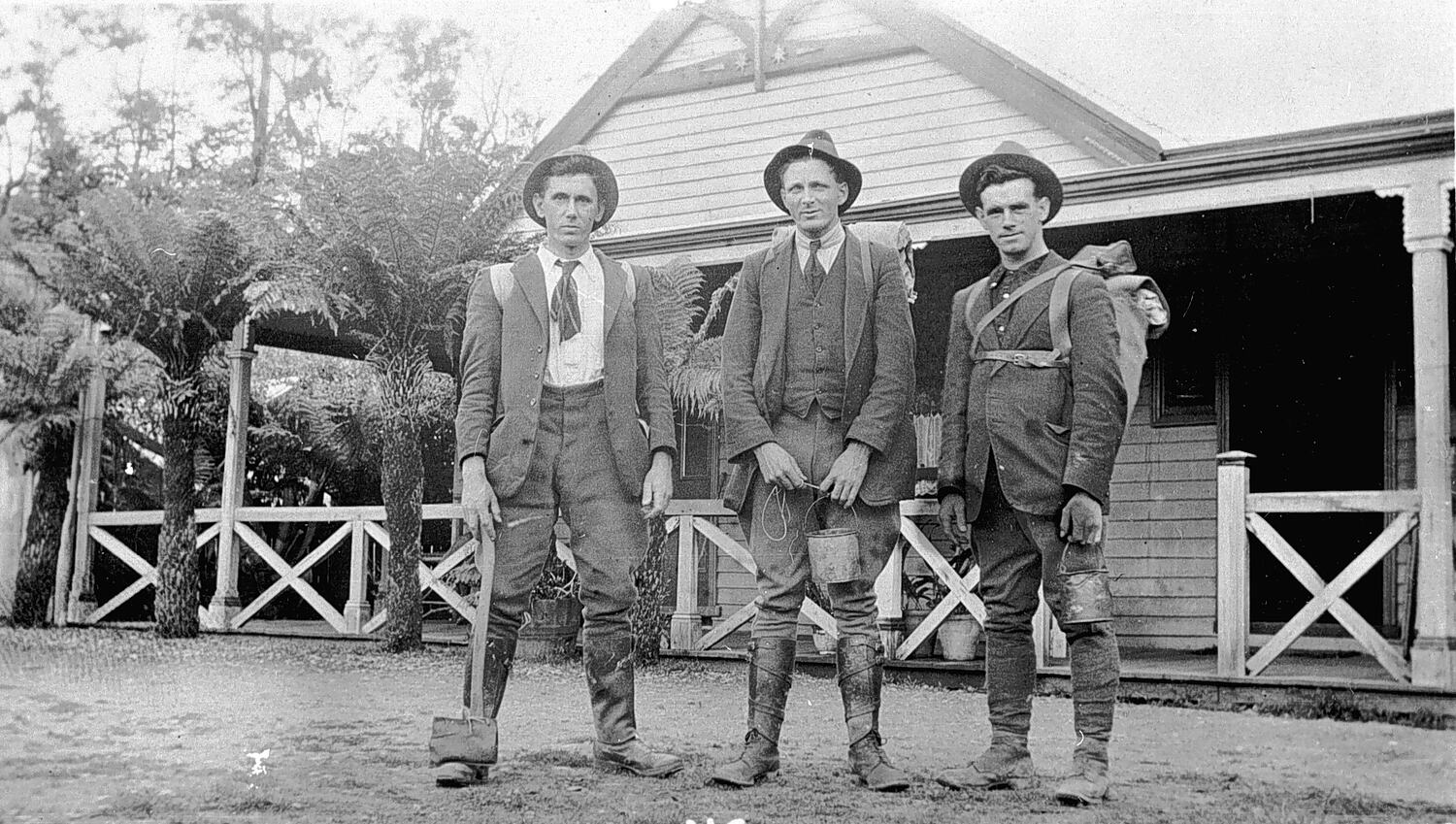 Three bushwalkers outside McVeigh's Hotel, Upper Yarra, near Warburton. They are about to leave for a bushwalk to Walhalla, via the Baw Baw Track. Two carry billies and one an axe.