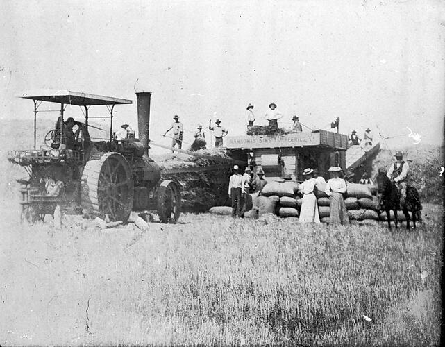 Agricultural Workers, Farms, Horses, Sacks, Steam Traction Engines, Threshing Equipment