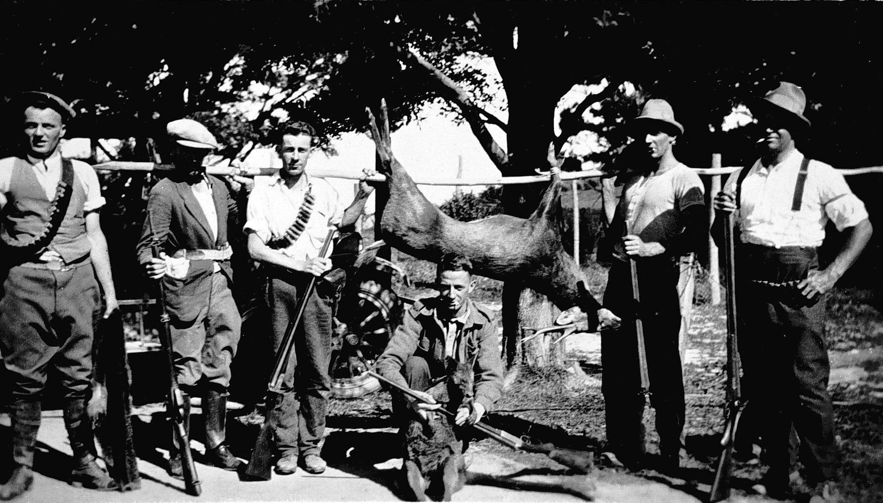 A group of men with shotguns and cartridge belts holding up a deer strung on a pole.