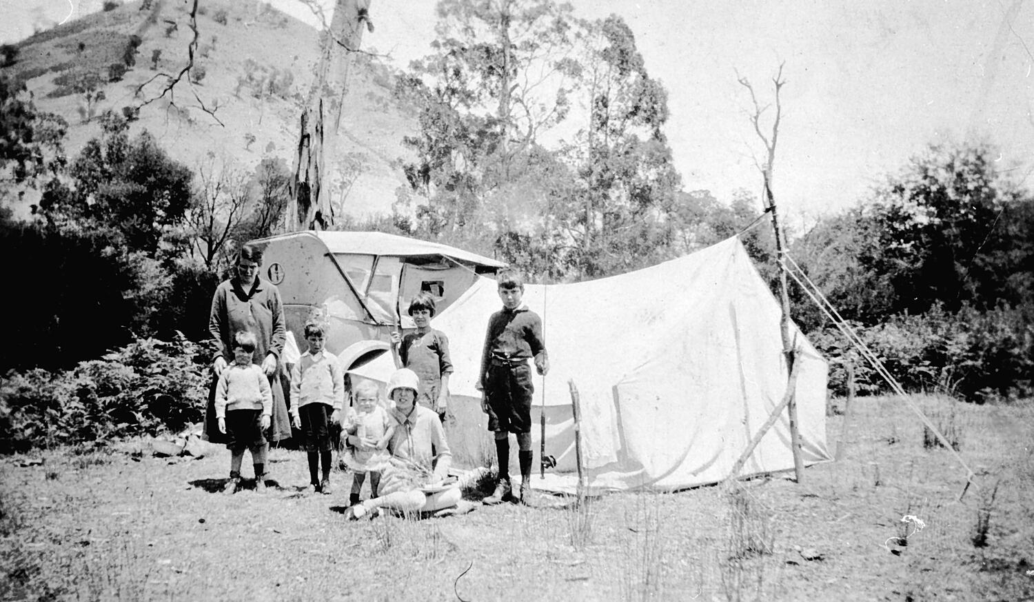 Women and children at a camp. There is a tent pitched beside a motor car.