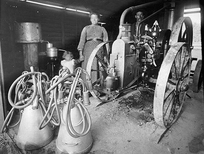 Agricultural Equipment, Agricultural Workers, Dairies, Families, Farms, Milking Machines, Oil Engines, Working Life, Women in Agriculture, Rural Women, Women on Farms, Women Farmers, Women's Work