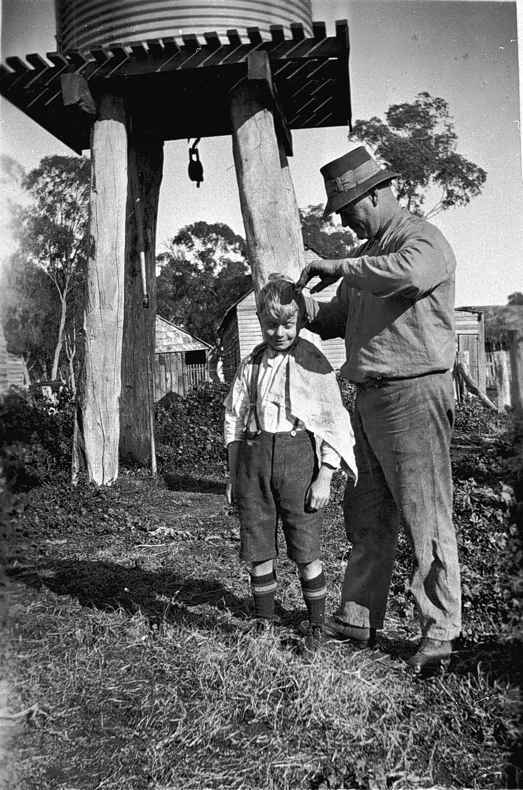 Les Morrison trimming the hair of his son Albert in front of a corrugated iron water tank on an elevated wooden stand. There is a farm house or buildings surrounded by a picket fence between trees in the background.
