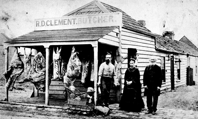 The butcher, his wife, their twin daughters and a friend in front of the shop of R.D. Clement, Butcher. Sides of meat hang along the verandah. The twin girls are Maggie and Belle.The man at right is Mr Knight, the father of Mrs Clements.