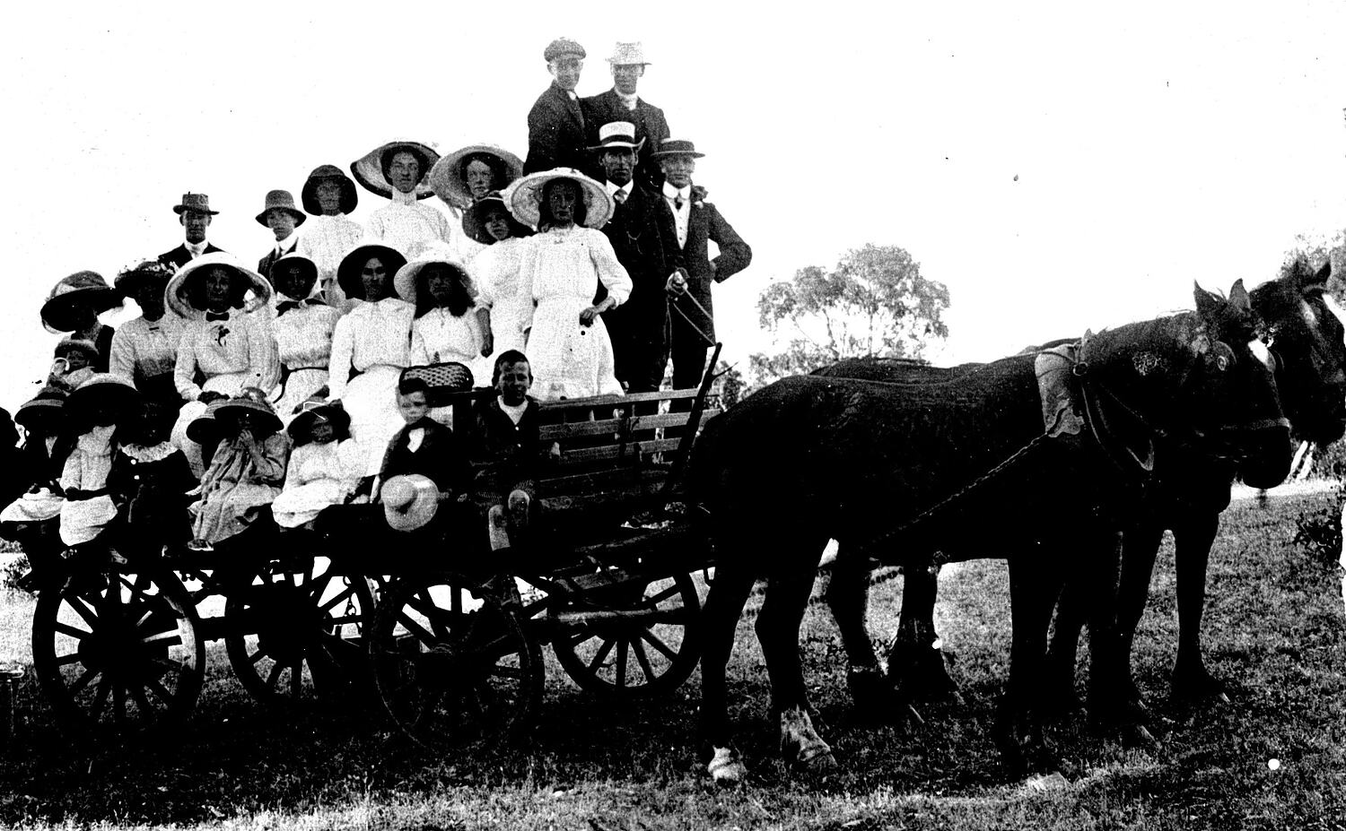 Large group of children and adults in a wagon drawn by three horses. They were on their way to a picnic.
