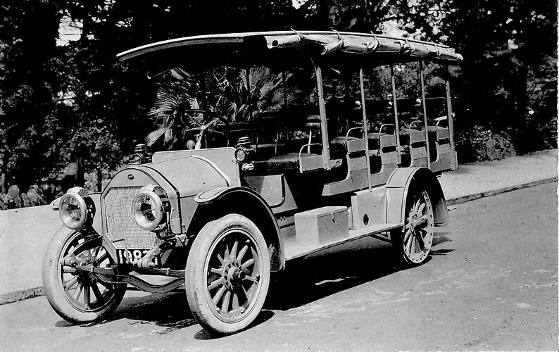 A motor coach. It has open sides with awnings rolled up and strapped to the roof.