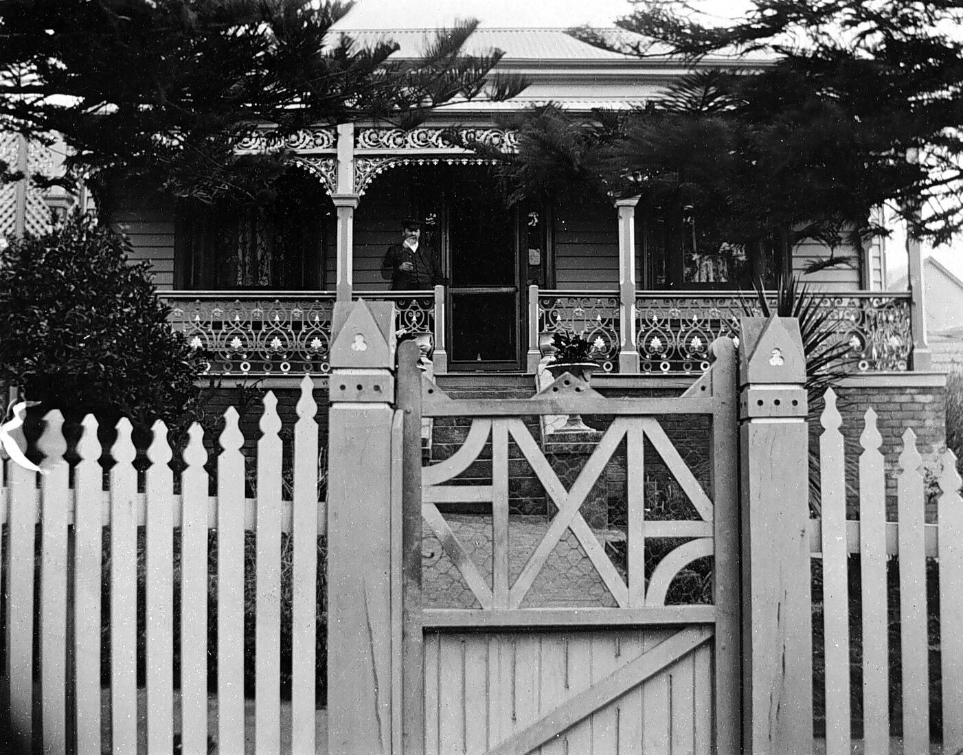 A man standing on the verandah of a small wooden house with an elaborate iron lacework verandah. There is a picket fence and gate in the foreground.