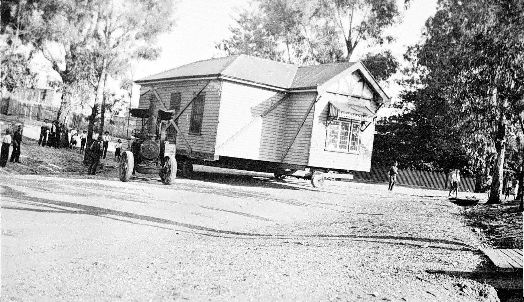 A steam traction engine being used to move a house. The house is braced by diagonal struts. The house and engine are turning a street corner. (see also MM 006893).