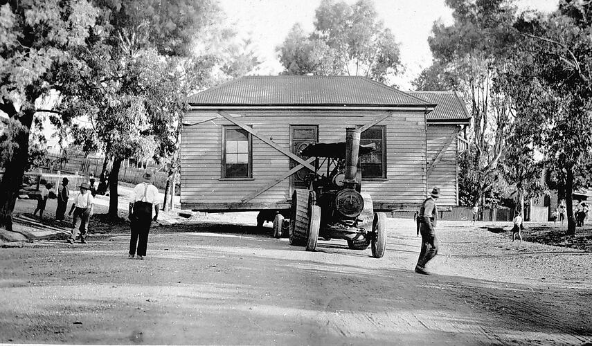 A steam traction engine being used to move a house. The house is braced by diagonal planks. (see also MM 006892).