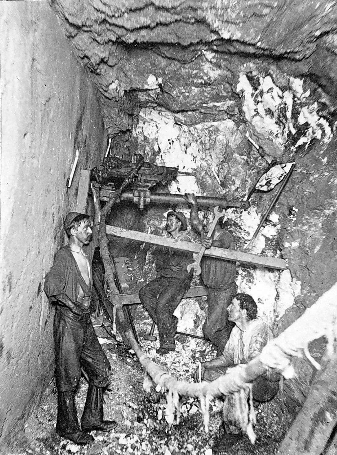 Miners fixing a rock borer at 1780 feet below the surface in the Great Northern Gold Mine.