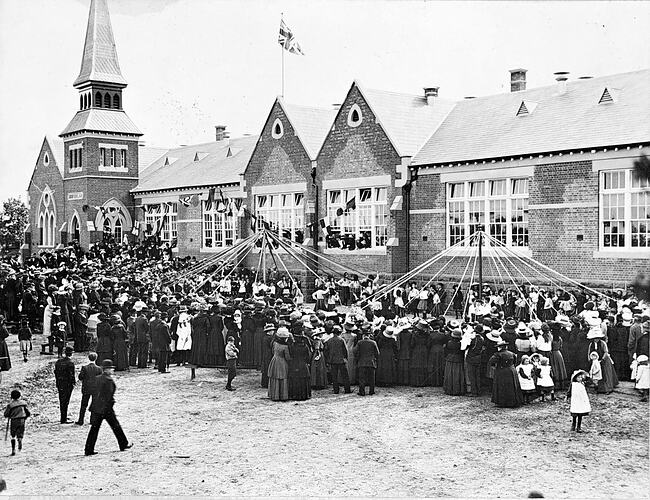 Crowds watching children and maypoles at the re-opening of the Ashby State School.
