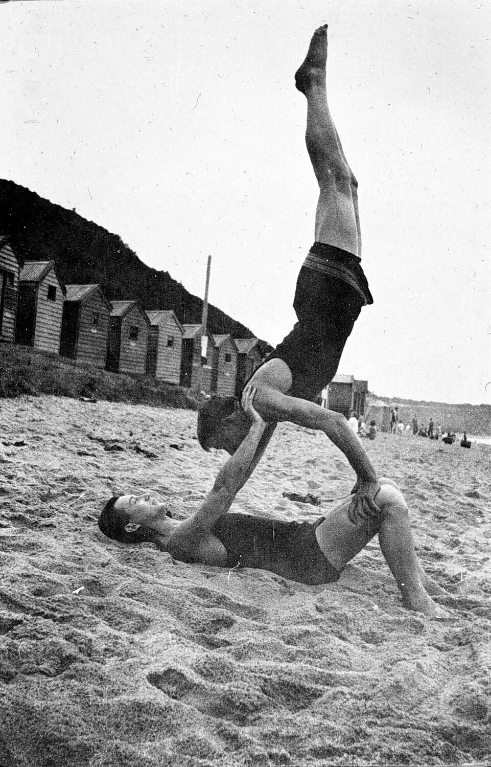 Two men on the beach; one is supporting the other in a handstand. There are bathing boxes in the background.