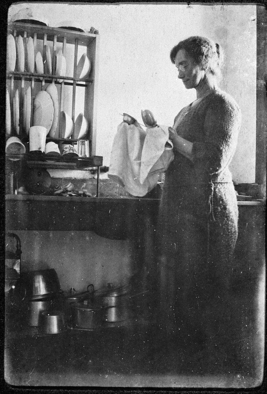 A woman drying dishes. There is a wooden plate rack on a bench and a stack of saucepans beneath the bench.