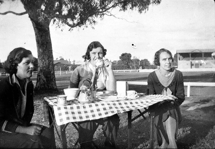 Three women having a cup of tea at the Mentone football Ground, Venice Street. They are at a picnic table with a tablecloth and tea setting.