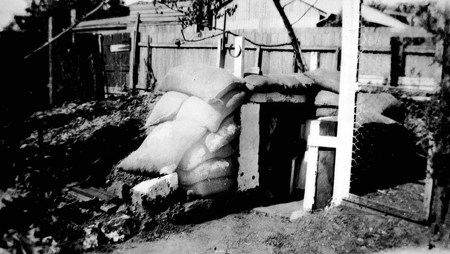 An air raid shelter in a backyard. It is protected by sandbags. There is a vegetable garden on the left and a chicken run on the right.