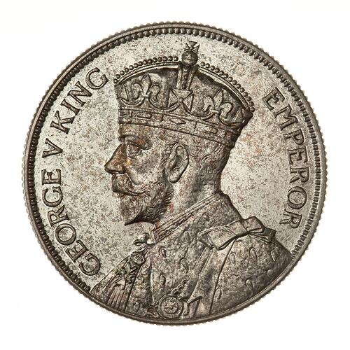 Crowned bust of the King facing left, the bust extends to the edge of the coin; around, GEORGE V KING EMPEROR