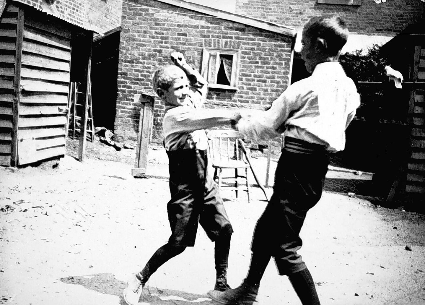 George & Lawrence Beckett pretending to fight in the backyard of their home in 180 High Street, Northcote. Photograph taken by Thomas Beckett.