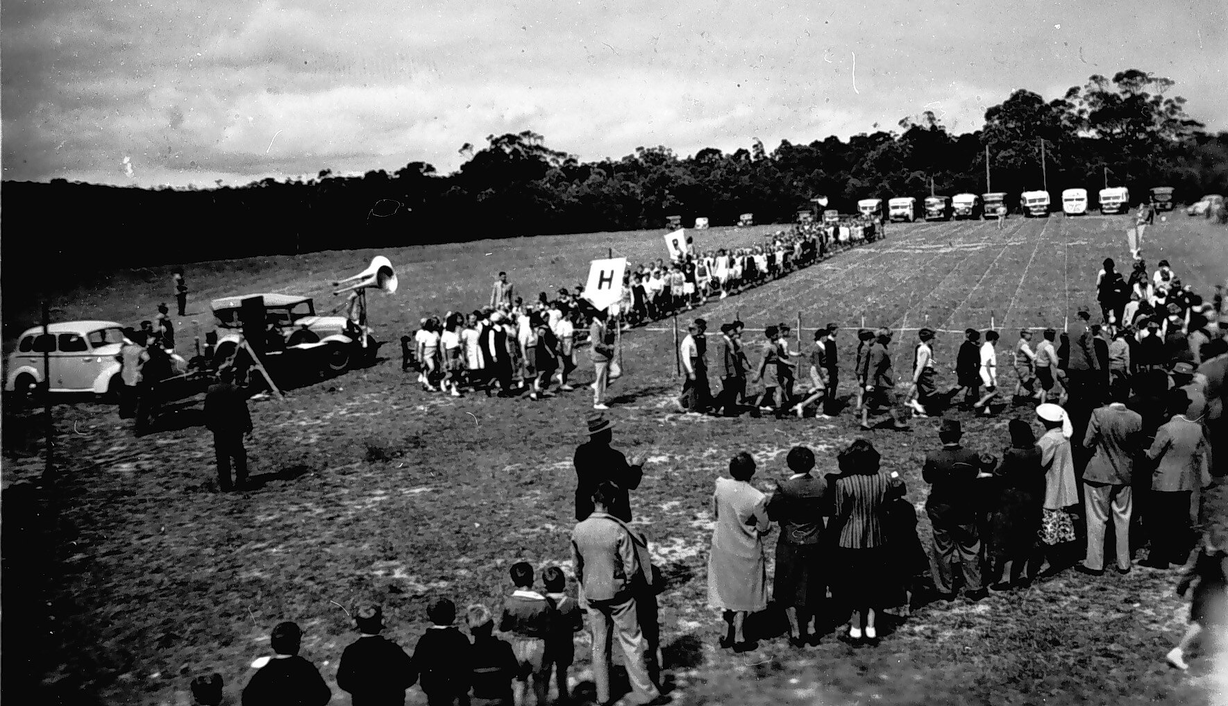 A parade of competitors at a school sports. There is a man carrying a flag with a large 'H' on it leading one group. There are onlookers in the foreground and a line of buses in the background. There are loudspeakers beside a car on the left.
