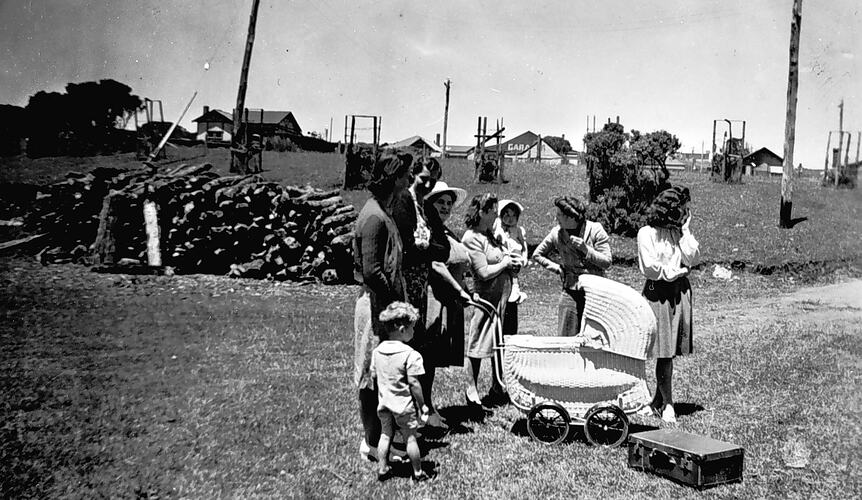 A group of women standing beside a pram. One woman holds a small child and there is a suitcase on the ground beside the pram. There is a woodpile behind the women and a number of tree guards behind that.