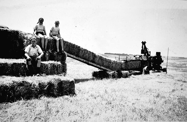 Hay baling. There is a stack of bales on the left and the hay baler on the right. Two girls sit on the ramp between the baler and the stack and a man sits on the stack.