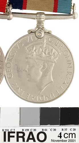 A cupro-nickel medal with mount and ribbon. The obverse features a crowned head of King George VI facing left; around, GEORGIVS VI D: G: BR: OMN: REX F: D: IND: IMP: (Translation - George VI by the Grace of God King of all the British, Defender of the Faith, Emperor of India); the artist's initials H.P. (T.H. Paget) in the field below the neck. The reverse depicts a lion standing facing left on a fallen two-headed dragon; in field above lion, 1939 1945; the artist's initials E.CR.P. (A. Carter Preston) in field to left of lion. The edge is impressed: V146990 J. FERRES