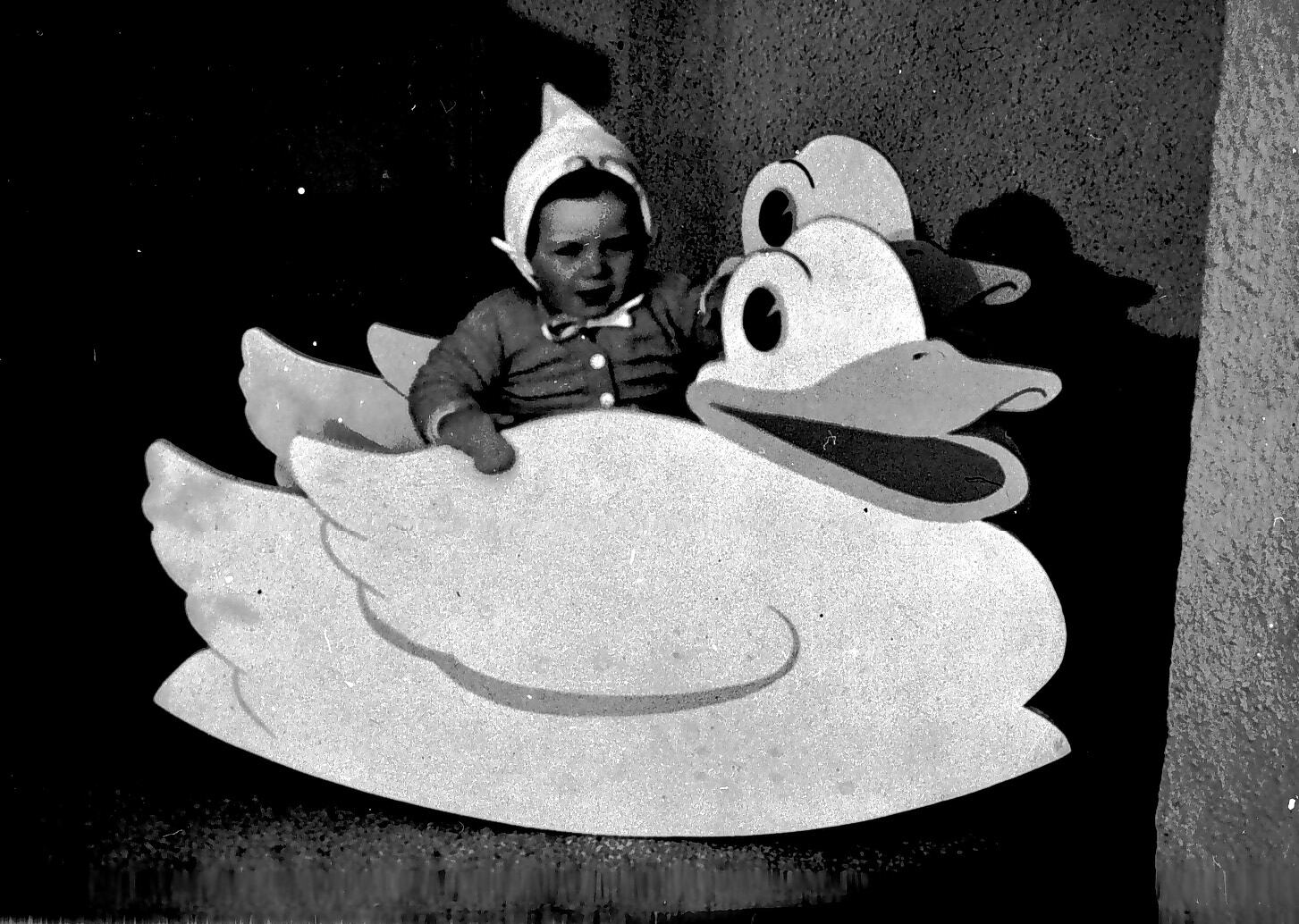 A small girl in a rocker shaped like a duck.