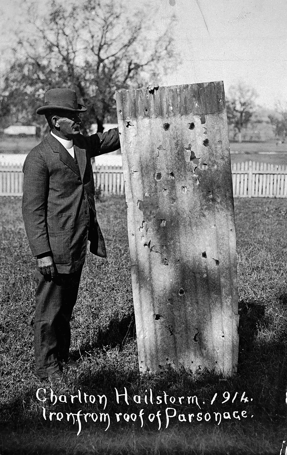 Hand written in white along bottom of photograph: "Charlton Hailstorm. 1914. / Iron from roof of Parsonage."