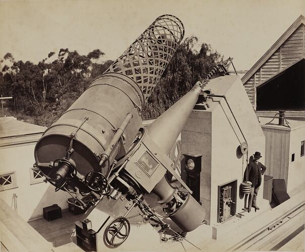 Overall view of the Great Melbourne Telescope in its purpose-built GMT House at the Melbourne Observatory, circa 1875. The photograph is taken from a vantage point on the elevated timber walkway around the external wall of the building near the north-west corner, with the moveable gable roof rolled back to reveal the telescope, A smartly dressed gentleman in a coat and bowler hat is standing in front of the south pier supporting the telescope, and is resting his right hand on the counterweights used to relieve the load in the south bearing of the polar axis. The person depicted is believed to be Joseph Turner, Assistant Astronomer, who was employed at the Melbourne Observatory as the observer with responsibility for the Great Melbourne Telescope from 1873 to 1883. Beside him in an alcove within the pier is the clockwork mechanism that provided power to the right-ascension drive allowing the telescope to automatically track objects in the sky for up to two hours. Trees and bush is visible in the background.