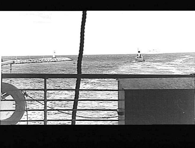 On board a ship lighthouse in background. Title:crossing our trail as she goes out.