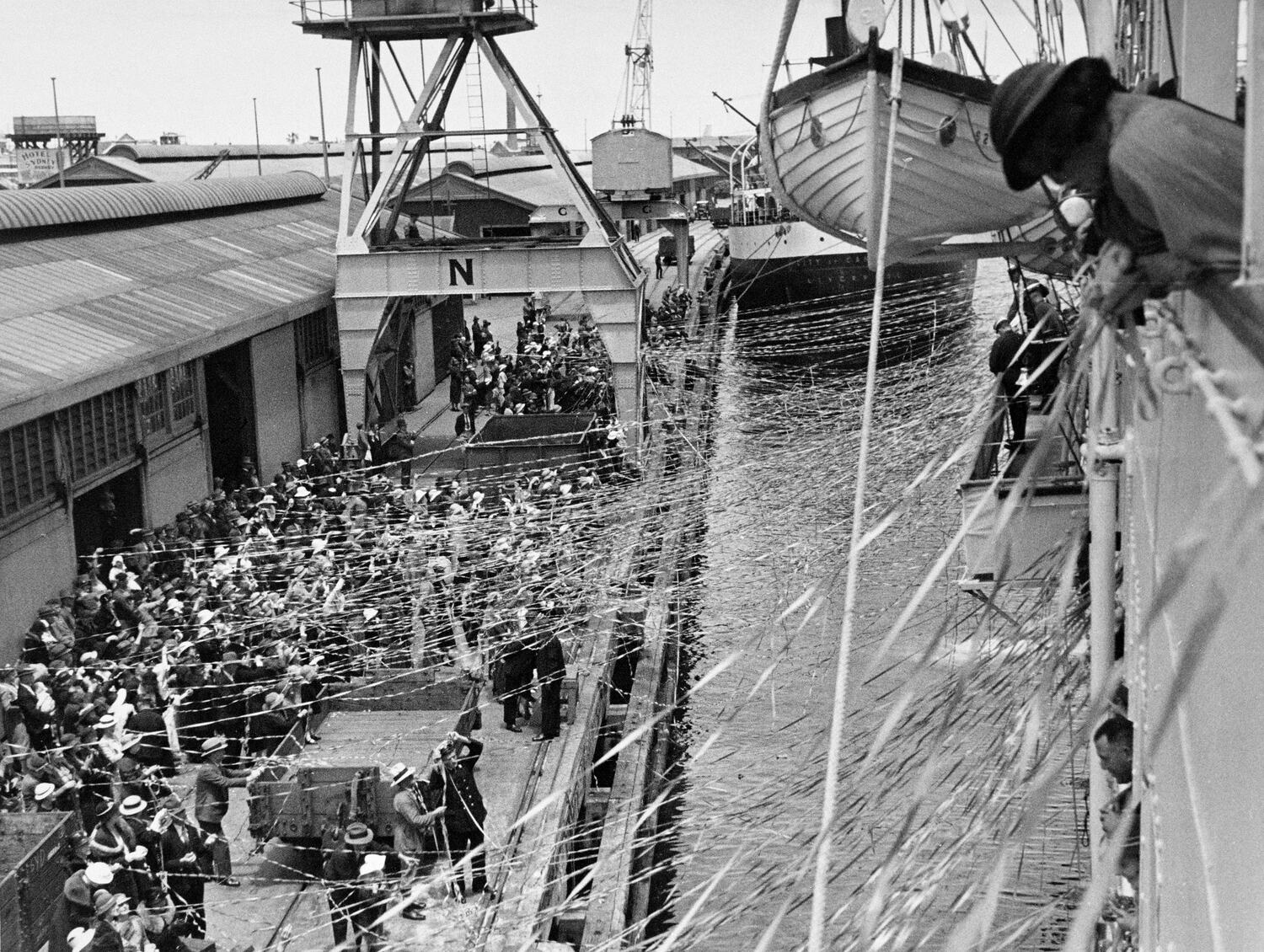 Crowd with streamers farewelling ship. Title: 'Au revoir at Fremantle.'