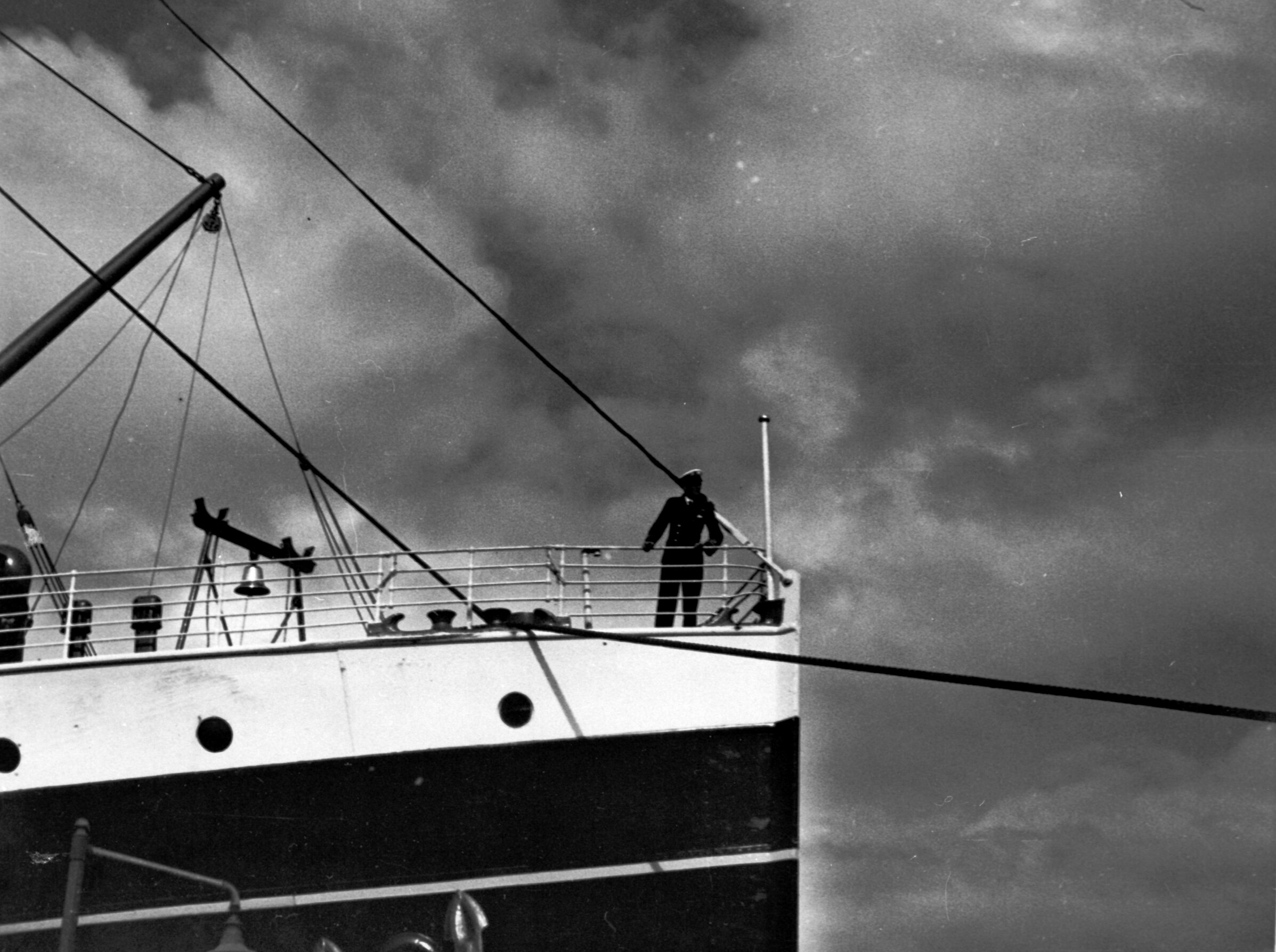 Captain on board a ship. Title: casting off the bow rope Captain Smith.