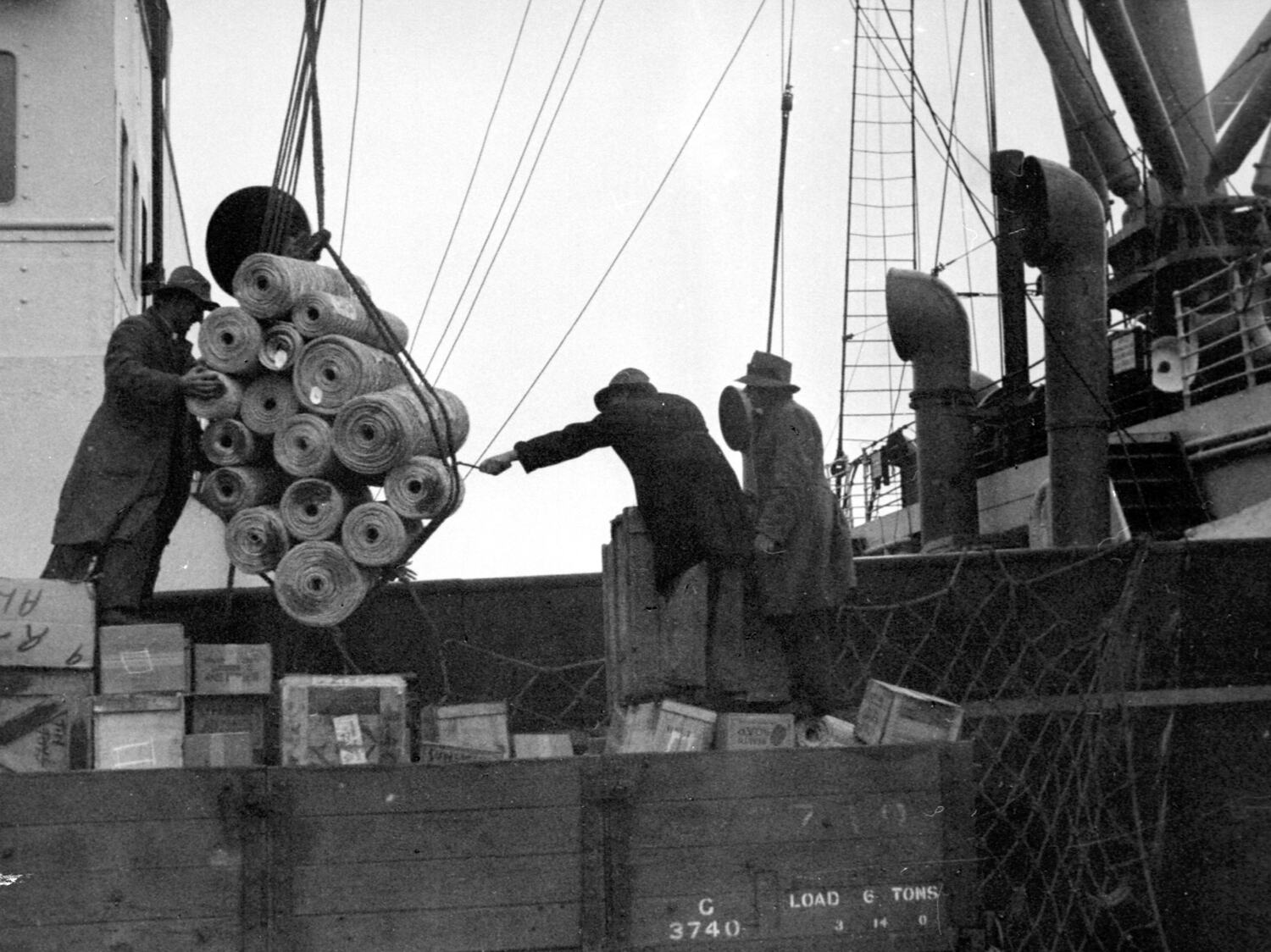 Unloading cargo from a ship. Title: Albany, unloading in the rain.