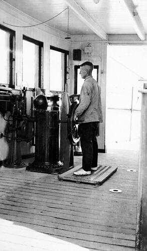 Male caucasian steering ship. Title:steady as you go.