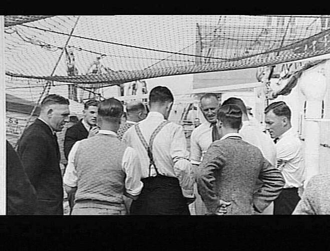 Group of men on board ship preparing to play a cricket match title:the captain tosses the deciding coin.