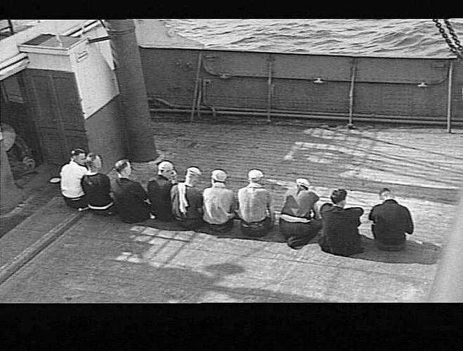 Ten men sitting in a row on a ship. Title: Tom do you remember the day we...