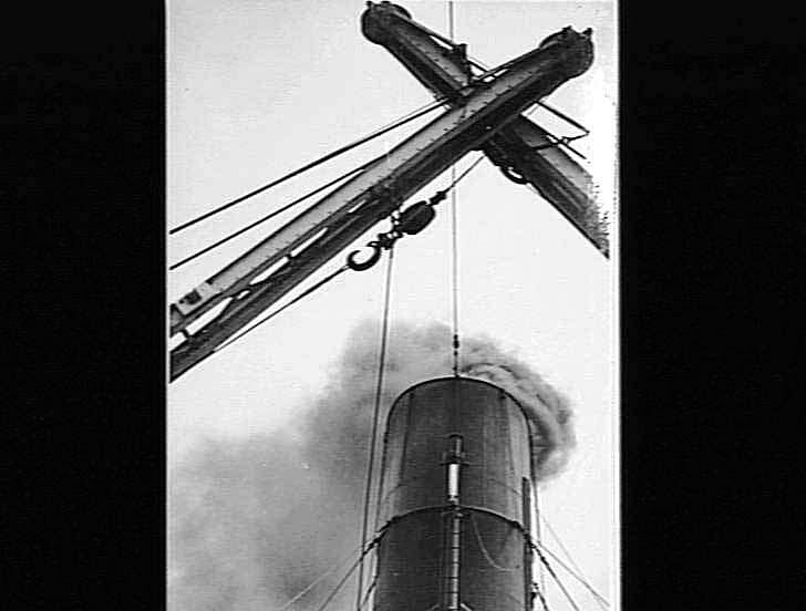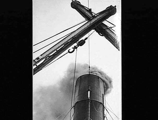 Smoke bellowing forth from ship 's smoke stack.