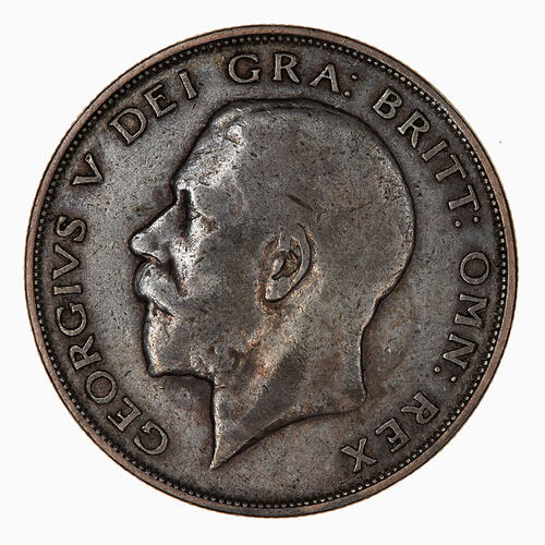 Bare head of the King facing left; below on neck truncation in small letters, B.M. (Bertram MacKennal); around, GEORGIVS V D.G. BRITT: OMN: REX F.D. IND: IMP: