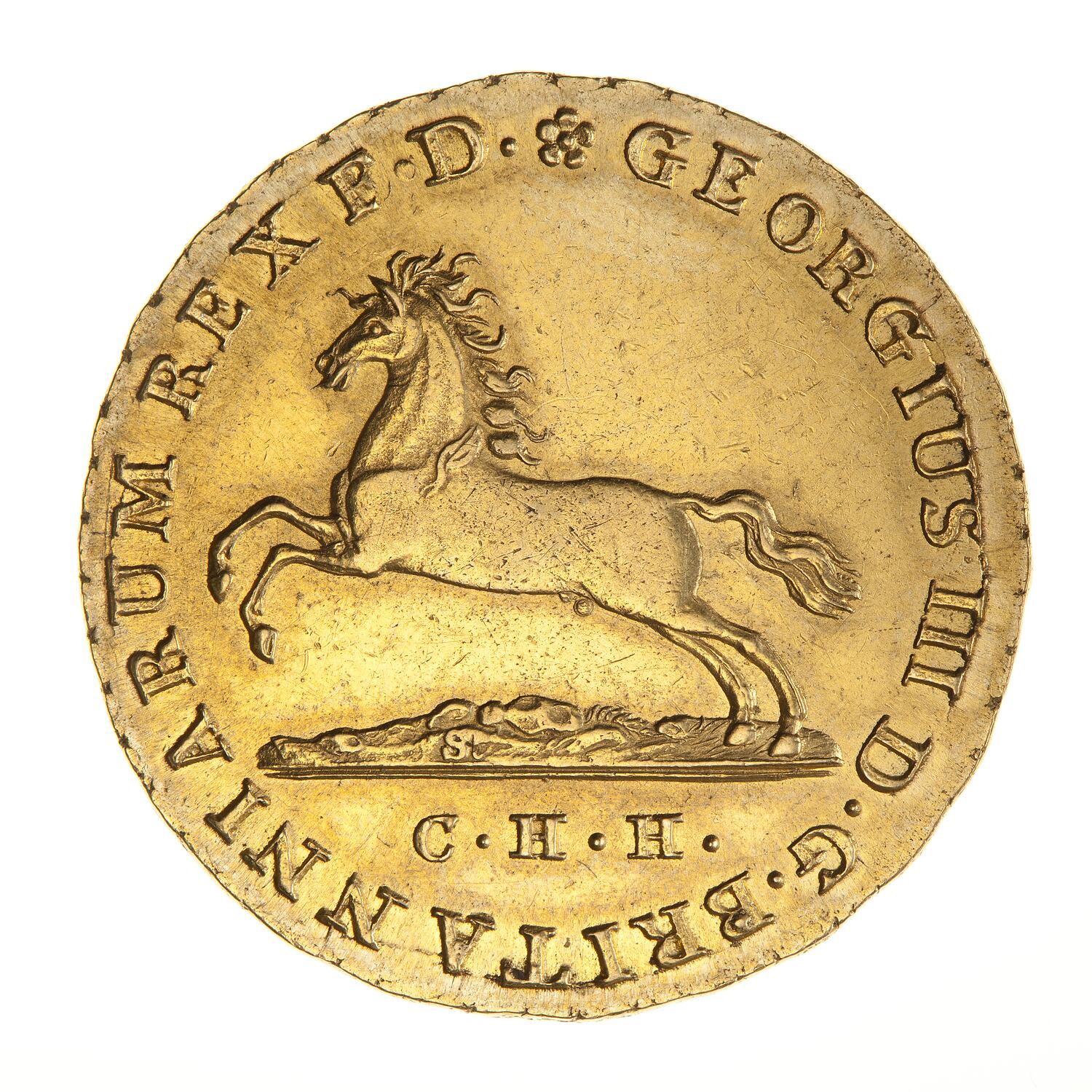 At centre horse advancing to left; below, C.H.H.; the letter S in ground under the horse; around, * GEORGIUS III D.G. BRITANNIARUM REX F.D.
