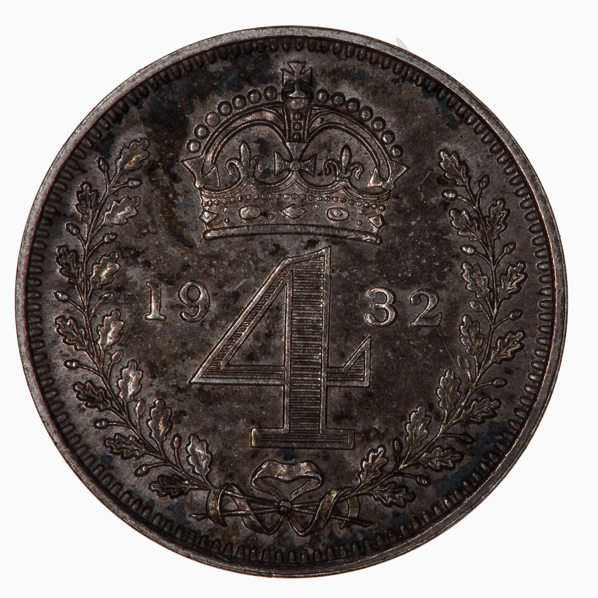 Within an open oak wreath the numeral 4 dividing the date 1932; above, crown.