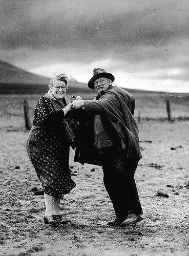 Copy negative of a couple dancing after three days of heavy rain broke an extended drought in the early 1930s. Francis (Frank) James Smith and Bridget Smith owned a mixed farm called Mt Fraser, near Beveridge, Victoria. The photograph was taken by a photographer from The Sun newspaper, Melbourne.