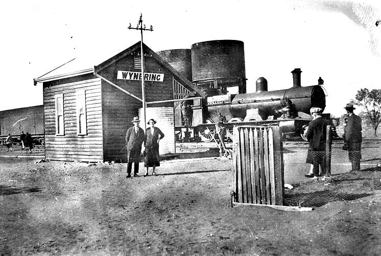 Passengers in front of small weatherboard station building at wynbring wait as steam train takes on water from elevated water tanks in background. This station was on the Trans-Australian Railway in the central west of South Australia north of Ceduna.