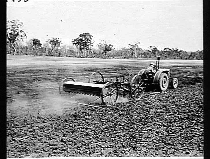 A Massey Harris Model 25 tractor hauling a H.V. McKay Model '20a' scarifier, an 8 ft 3 inch'Sunflow' with seeding attachment followed by a set of'Suntow' covering harrows.