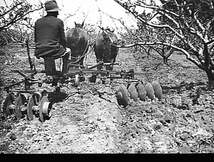 A horse-drawn 'Sunreach' showing the extended disc-gang for cultivating under the branches in an orchard.