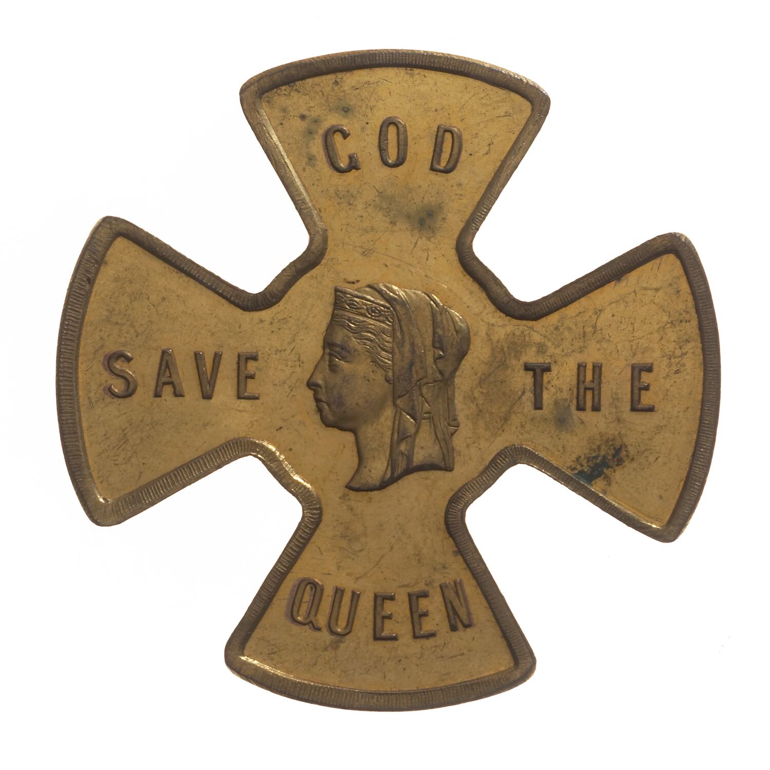 Veiled head of Victoria left; on arms of cross, GOD SAVE THE QUEEN