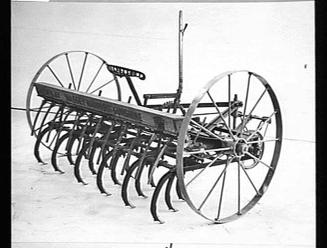 A horse-drawn 16 rigid-tyne lucerne renovator fitted with a special small seeds box for the regeneration and sowing of lucerne crop. Drive for the seed distribution is by flat-steel chain from the right hand side Wheel and seed drop is by rubber tubes.