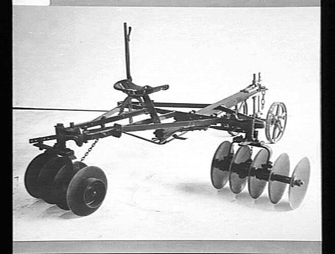 Side view of a horse-drawn 'Sunreach' 9-disc cultivator used in orchards and vineyards. Each gang of discs was supported by two arms and angle of cut was by hand-operated lever. Bearing inserts were made of redgum wood.